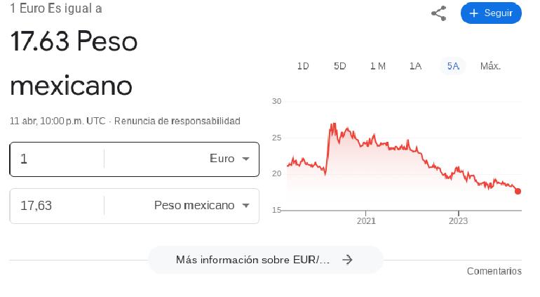 El euro siguió bajando y al corte de las 15:36 (hora centro de México) cotiza en 17.63, marcando un nuevo mínimo del sexenio y no visto desde julio del 2015.