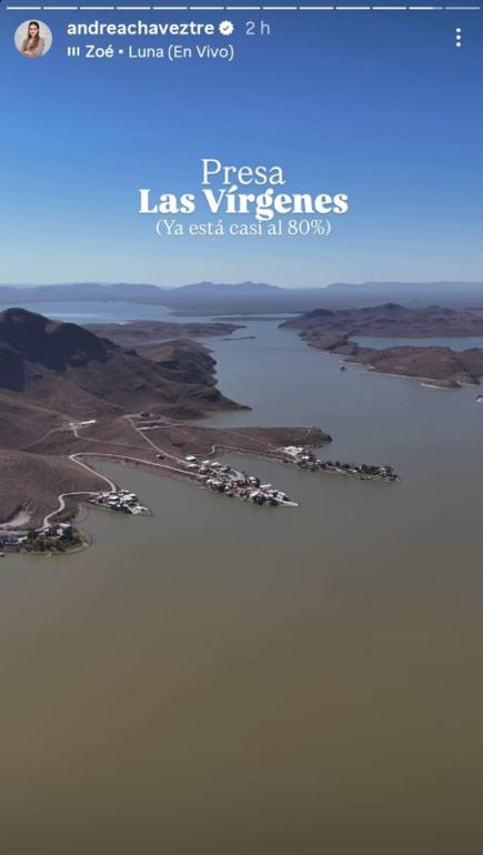 Compartió la senadora Andrea Chávez imágenes en sus historias de Instagram de este 13 de noviembre, de su visita a la presa Francisco I. Madero (más conocida como Las Vírgenes) en el municipio de Rosales.