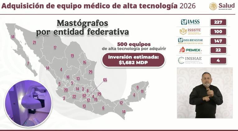 La presidenta de México, Claudia Sheinbaum Pardo, anunció una inversión nacional de 11 mil 257 millones de pesos para la adquisición de 816 equipos médicos de alta tecnología, para Chihuahua se contempla 17 mastógrafos, cuatro tomógrafos y una resonancia magnética.