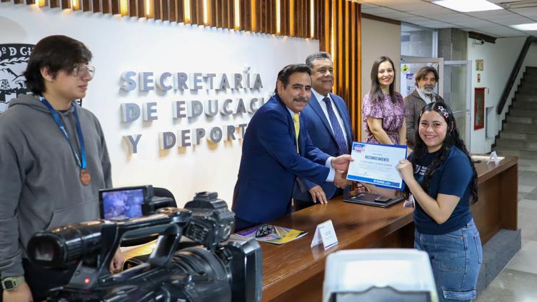 En el lobby de las instalaciones de la Secretaría de Educación y Deporte, se llevó a cabo la entrega de reconocimiento a estudiantes que tuvieron una participación destacada en la Olimpiada de Informática en Chihuahua.