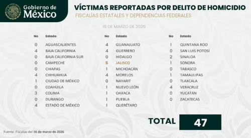 Específicamente, el reporte correspondiente al 16 de marzo contabiliza a nivel nacional 47 víctimas por delito de homicidio.