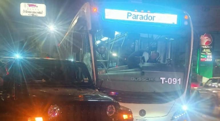 Este domingo se registró un encontronazo entre una camioneta Jeep y una unidad del Juárez Bus en la avenida Paseo Triunfo de la República.