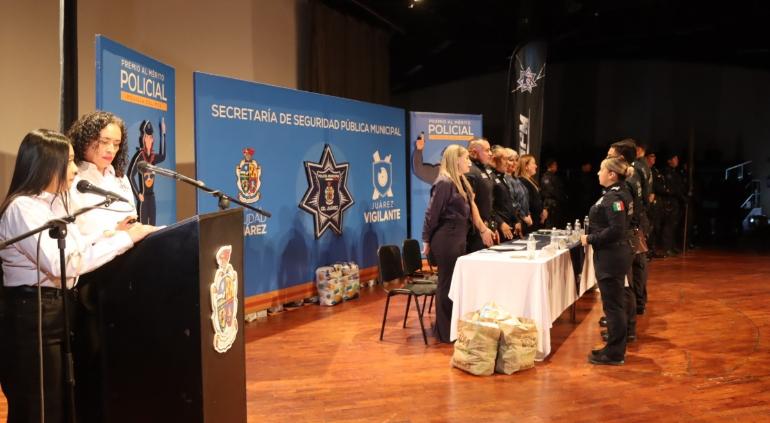Durante el evento, realizado en el Centro Cultural Ernesto Ochoa Guillemard, el elemento fue condecorado con un distintivo conmemorativo al mérito por perseverancia, en reconocimiento a su compromiso, entrega y trayectoria al servicio de la comunidad juarense.