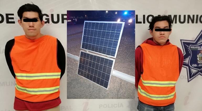 Agentes municipales realizaron el arresto de Jesús Guadalupe N. C. y Juan Salvador N. C., por su presunta responsabilidad en la comisión del delito de robo, tras hurtar paneles solares de alumbrado de un parque.