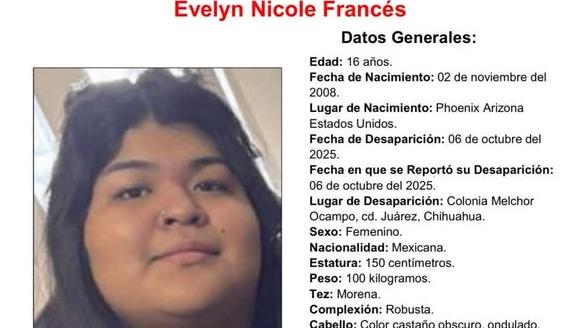 La Fiscalía difundió la pesquisa de Evelyn Francés, una jovencita de 16 años de edad originaria de Arizona, quien desapareció tras salir de su casa en la colonia Melchor Ocampo, en Ciudad Juárez.