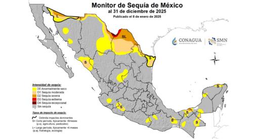 Al 31 de diciembre de 2025, el porcentaje de áreas con sequía de moderada a excepcional (D1 a D4) a nivel nacional fue de 9.3%, valor similar a lo registrado al 15 de diciembre del mismo año (9.7%)".