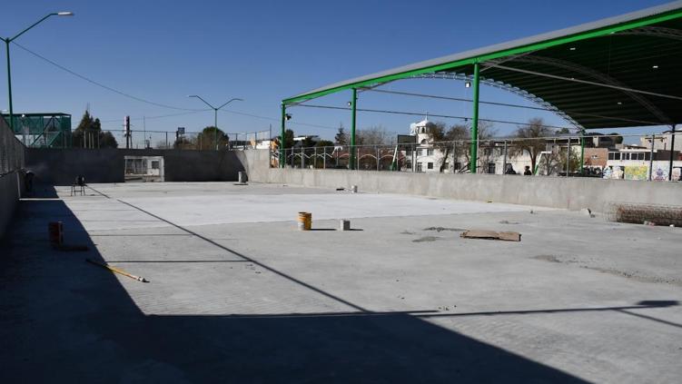 Personal de Obras Públicas trabaja en la rehabilitación de una cancha de futbol así como da mantenimiento a un domo, en las instalaciones del Plantel 6 del Colegio de Bachilleres.