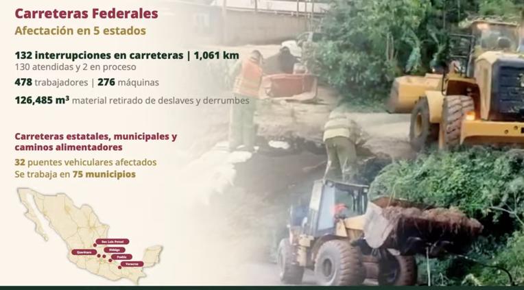 El secretario de Infraestructura, Comunicaciones y Transportes, Jesús Antonio Esteva Medina, informó que las lluvias extraordinarias de los últimos días provocaron 132 interrupciones en carreteras federales, que afectaron más de 1,060 kilómetros en Veracruz, Hidalgo, Puebla, Querétaro y San Luis Potosí. De ellas, 130 ya fueron reparadas, mientras que dos permanecen cerradas en Hidalgo por el desbordamiento de ríos.