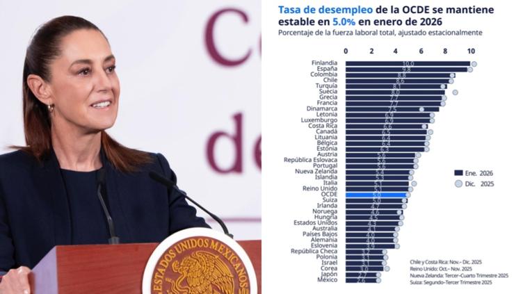 La presidenta de México, Claudia Sheinbaum Pardo, destacó que el país registró la menor tasa de desempleo entre los países de la Organización para la Cooperación y el Desarrollo Económicos (OCDE), de acuerdo con datos correspondientes a enero de 2026.