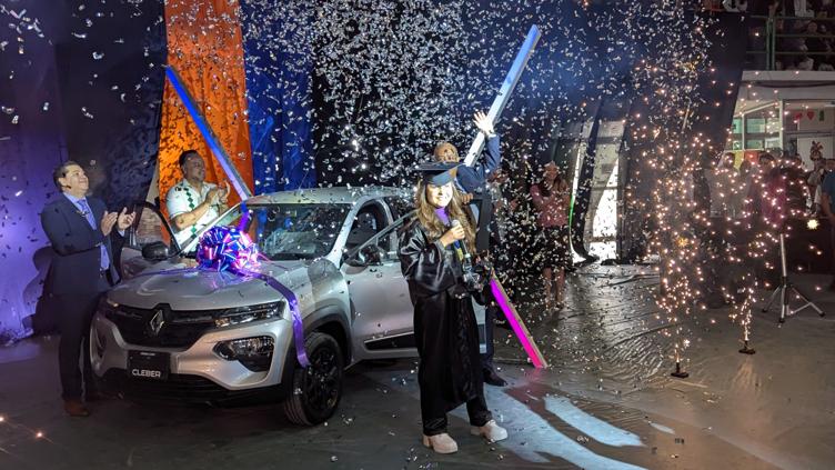 Vestida de toga y birrete, y acompañada de sus padres, la estudiante recibió las llaves del automóvil de parte de Hugo Gutiérrez Dávila, titular de la Secretaría de Educación y Deporte (SEyD).
