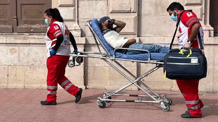 Paramédicos de la Cruz Roja Mexicana arribaron al lugar y por una manifestación tuvieron que quedarse sobre la Vicente Guerrero y Aldama.