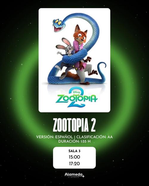 En la sala 3 se proyecta Zootopia 2 en español, con funciones a las 15:00 y 17:20 horas, además de Código Venganza subtitulada a las 19:40 horas.