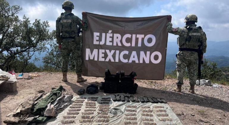 Elementos del Ejército Mexicano y fuerzas federales reventaron un campamento clandestino con municiones y equipo táctico en las inmediaciones del poblado La Guayanera, municipio de Concordia, Sinaloa.