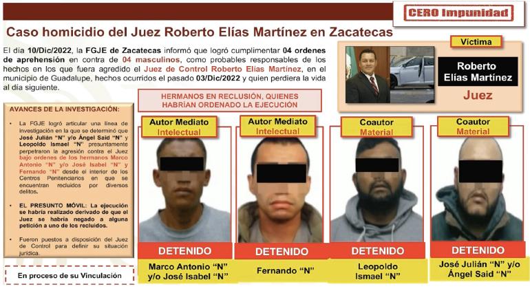 Detuvieron a cuatro involucrados en el delito de homicidio del juez Roberto Elías Martinez, hechos que ocurrieron días pasados en Zacatecas.