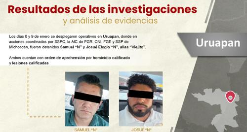 De acuerdo con la información oficial, las detenciones se realizaron los días 8 y 9 de enero, tras operativos desplegados en el municipio de Uruapan como parte de acciones coordinadas entre las instituciones que integran el Gabinete de Seguridad del Gobierno de México. Los detenidos fueron identificados como Samuel “N” y Josué Elogio “N”, alias “Viejito”.