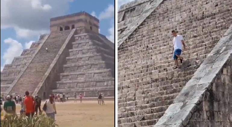 En el video se puede ver cómo el joven pasa los límites permitidos y va subiendo uno a uno los escalones de la pirámide de Kukulcán hasta llegar al que se conoce como Castillo para luego volver a bajar.