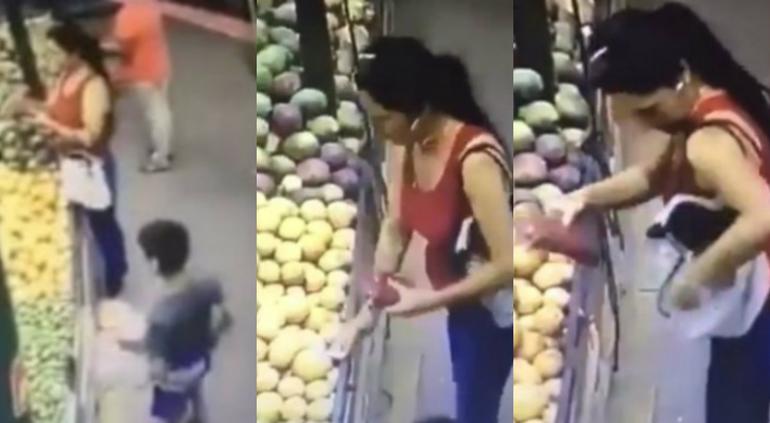 El video se viralizó el 15 de abril cuando la mujer robó el billete en el puesto de frutas y verduras en el local de Apatzingán cuando el menor dejó el billete encima de ellas mientras escogía la mercancía.