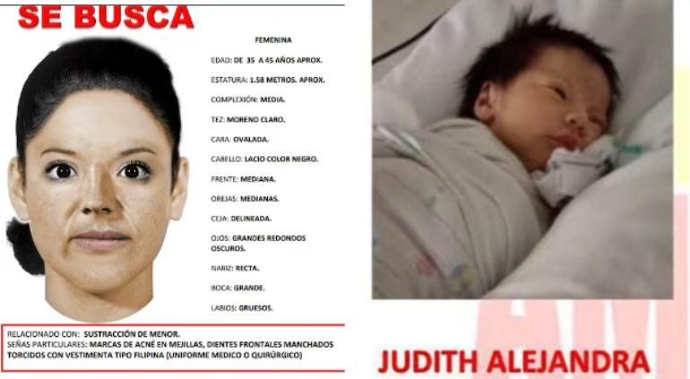 Las autoridades identificaron a la mujer que se llevó a la bebé como de entre 35 a 45 años, 1.58 centímetros de estatura aproximadamente, tez morena clara, cara ovalada, ceja delineada, boca grande y labios gruesos.