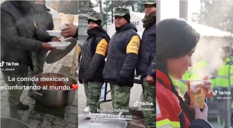 “La comida mexicana reconfortando al mundo”, señala el funcionario en el video en el que un soldado mexicano explica que darán de comer a los afectados sopita, frijolitos refritos y barbacoa de res.