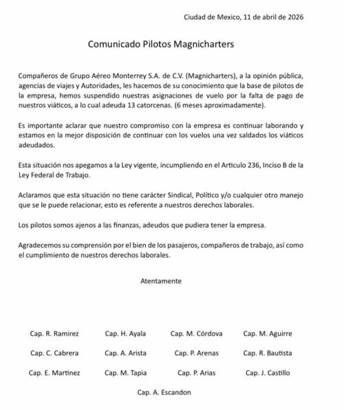 Pilotos de la aerolínea Magnicharters informaron la suspensión de sus asignaciones de vuelo debido a la falta de pago de viáticos, situación que, aseguran, se ha extendido por aproximadamente seis meses.