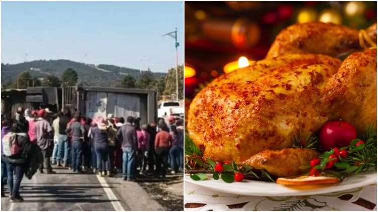 Los pobladores de un municipio de Veracruz, aprovecharon que un tráiler se volcó en la carretera para poder rapiñar al menos 20 toneladas de pavo que estaba destinado a la temporada decembrina.