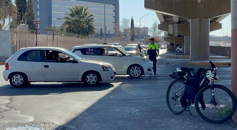 Un elemento de la Policía Vial abanderó el tráfico durante esta tarde en el cruce de la avenida Pacheco y la avenida Teófilo Borunda, específicamente en la lateral, pues en días anteriores ocurrió el derribamiento de un semáforo.