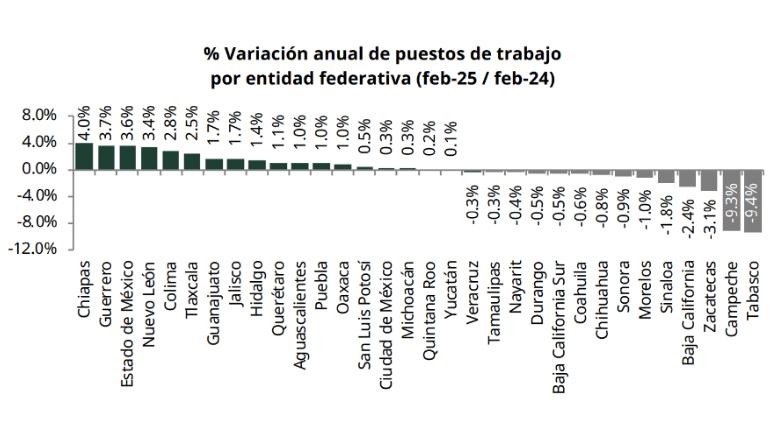 Por el lado contrario, Chiapastuvo un aumento del empleo formal del 4.0% durante el mismo período, Guerrero del 3.7%, Estado de México 3.6%, Nuevo León de 3.4% y Colima del 2.8%.