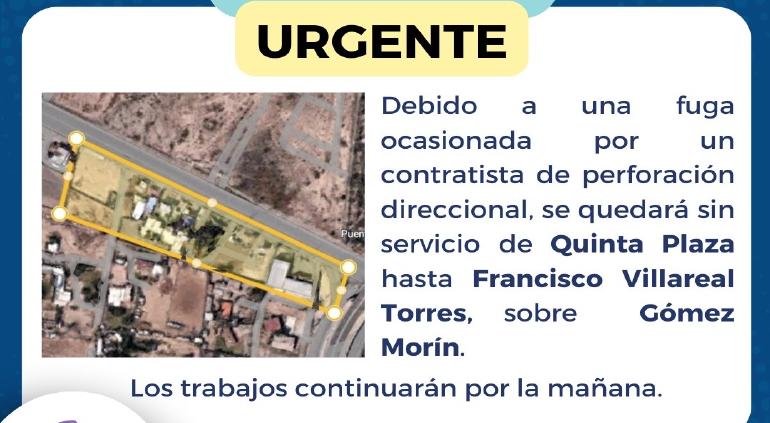 Aunque las reparaciones comenzaron el martes, el daño en múltiples puntos de la línea obligó a suspender las labores durante la noche. Estas se retomarán este miércoles, dejando sin agua el tramo sur del bulevar Gómez Morín, entre Quinta Plaza y Francisco Villarreal Torres, en dirección poniente-oriente.