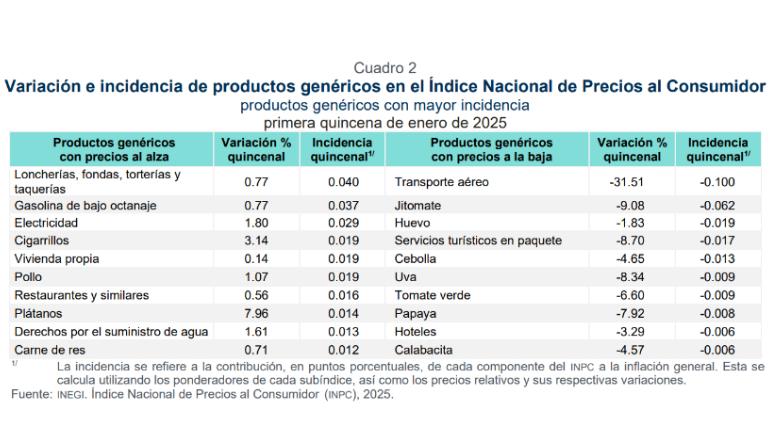 En la primera quincena de enero de 2025, el Índice Nacional de Precios al Consumidor #INPC presentó un nivel de 138.257 y representó un aumento de 0.20% respecto a la quincena previa. Con este resultado, la inflación general anual se ubicó en 3.69%.