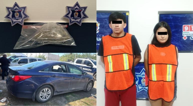 La Policía Municipal informó la detención de Eder Alejandro L. G. de 19 años y a Ivonne Guadalupe G. G., de 18 por su presunta responsabilidad en la comisión del delito en posesión de vehículo con reporte de robo y delitos contra la salud.