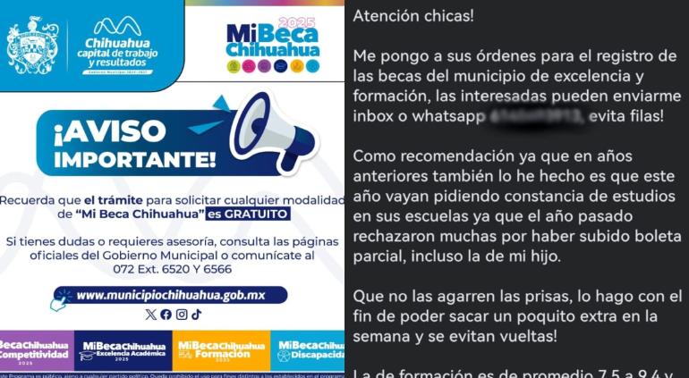 El Gobierno Municipal de Chihuahua informó que todos los trámites relacionados con el programa "Mi Beca Chihuahua 2025", en cualquiera de sus modalidades, son totalmente gratuitos. Esto incluye las categorías de Competitividad, Excelencia Académica, Formación y Discapacidad.