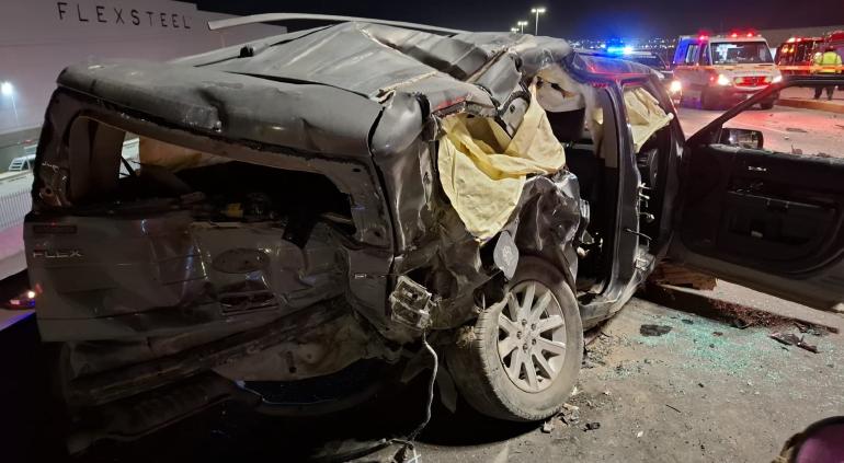 Una camioneta Ford Flex 2009 circulaba sobre el bulevar Independencia en un sentido de oriente a poniente y al llegar al cruce de la Miguel de la Madrid, brincó el camellón central, impactando de frente a la patrulla Silverado, que circulaba de poniente a oriente.