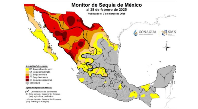 De acuerdo a la imagen de Monitor de Sequía indica que la zona norte del estado grande tiene un "impacto de sequía" entre un período corto y largo, alrededor de seis meses, mientras que el centro y sur de la entidad tiene un impacto de más de seis meses.
