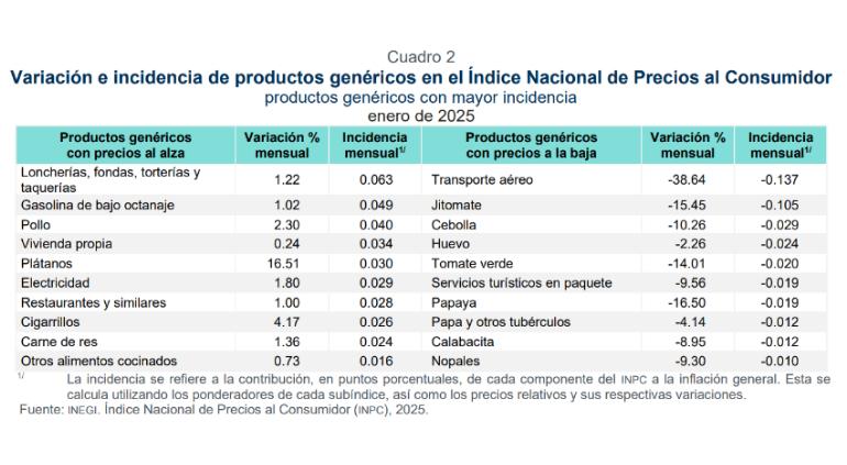 Luego, mostró en una tabla los productos genéricos que tuvieron mayor incidencia a la alza en la inflación entre el 1 y 31 de enero: