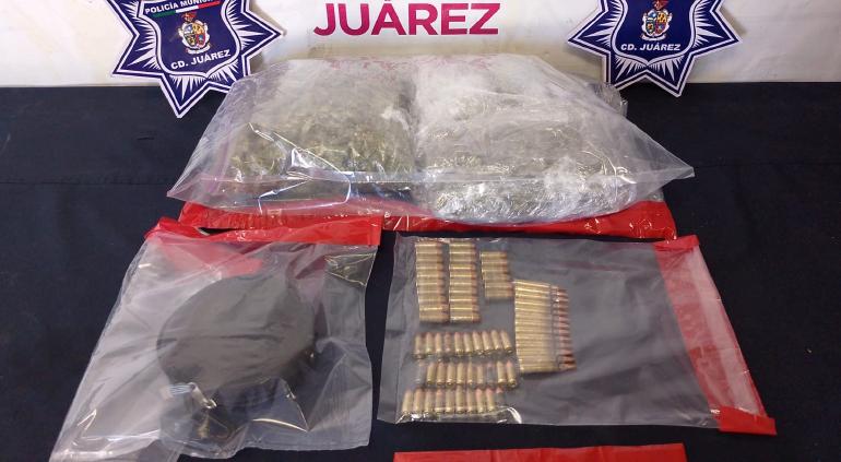 Por este motivo le marcaron el alto en las calles Rancho La Nutria y Rancho Malpaso, y al realizarles una inspección preventiva les localizaron tres envoltorios de plástico con marihuana con un peso aproximado de 994 gramos y un estuche negro con 26 cartuchos útiles calibre .45, 30 cartuchos calibre 9 milímetros y 13 cartuchos calibre .223.