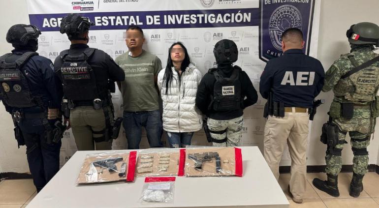 En un cateo realizado en el fraccionamiento Cerrada de Olivar, fueron detenidos “La Tortuga” y “La Chola”, identificados como integrantes de La Línea, quienes tenían en su poder armas y drogas.