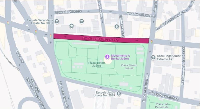Desde esta mañana hasta el próximo lunes 7 de abril, la avenida Vicente Guerrero permanecerá cerrada en un tramo que va desde la calle Ramón Corona hasta Constitución, frente al Monumento a Benito Juárez.