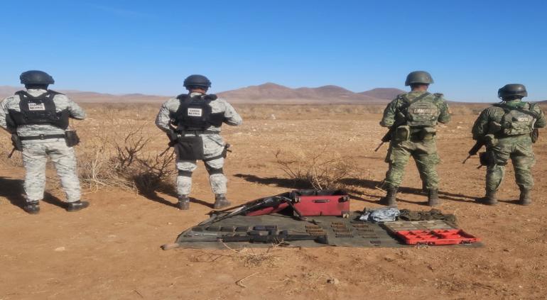 Elementos de la Guardia Nacional (GN) y del Ejército Mexicano (Defensa) descubrieron armas, un tripie metálico, cartuchos y equipo táctico en una brecha de Casas Grandes, noroeste del estado de Chihuahua.