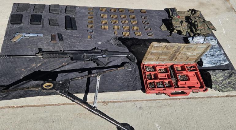 La Secretaría de Seguridad y Protección Ciudadana (SSPC) federal dio a conocer que en Casas Grandes "elementos de la GN y del Ejército Mexicano, en un camino de terracería, aseguraron un arma larga, un arma corta, cargadores, cartuchos, un chaleco y ropa tácticos, así como un tripeé metálico".