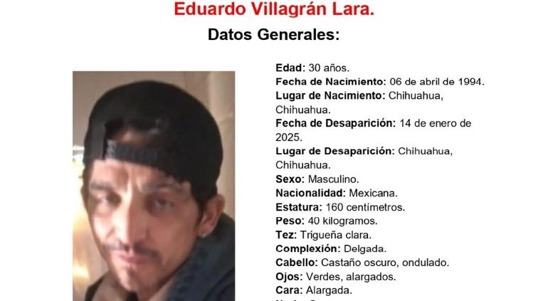 La Fiscalía General del Estado, publicó la pesquisa de Eduardo Villagrán Lara, de 30 años de edad, quien fue visto por última vez el 14 de enero en la ciudad de Chihuahua.