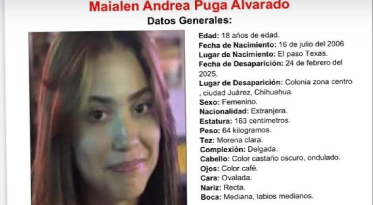 Se trata de Maialen Andrea Puga Alvarado, originaria de El Paso, Texas, quien fue vista por última vez el pasado lunes 24 de febrero en el Centro de Ciudad Juárez.