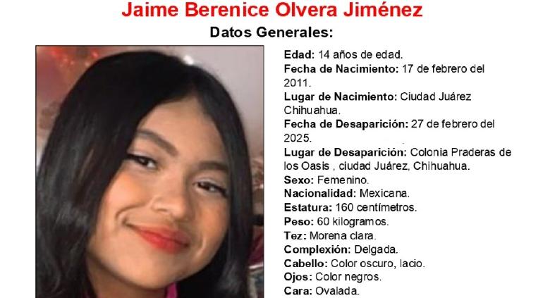 La Fiscalía General del Estado difundió la fotografía de Jaime Berenice Olvera Jiménez, de 14 años de edad, a fin de solicitar la colaboración de la ciudadanía para localizarla.