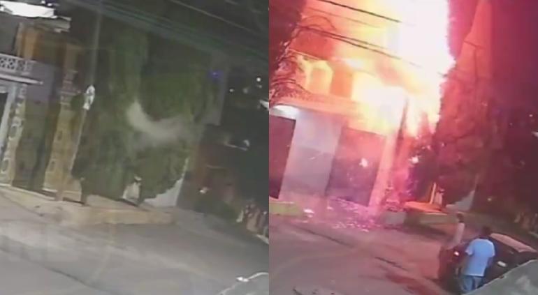 En el video tomado por cámaras de seguridad, se ve los pinos y cómo es que cerca del lugar están lanzando varios cohetes y fuegos artificiales que pasan cerca de los pinos y de la casa en donde están.