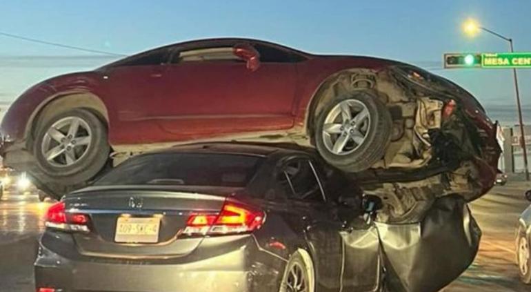 Encontronazo en la Talamás; auto quedó arriba de otro