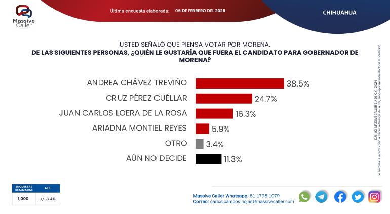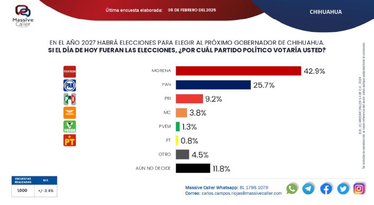 En la Galopada rumbo a la Gubernatura del Estado de Chihuahua del 2027 el partido con más preferencias es Morena con 43%, seguido el PAN y el PRI, de acuerdo con la encuesta de Massive Caller.