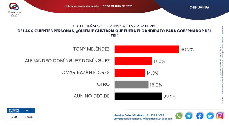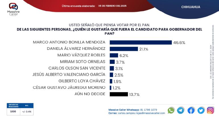 Realizó la encuestadora 1 mil consultas con el método de llamadas telefónicas aleatorias, con margen de error del +/-3.4, donde preguntó a los chihuahuenses su preferencia de partido político y sobre quién les gustaría que fuera el candidato según el partido.