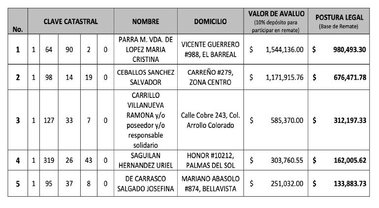 Realizarán este 20 de febrero el remate de cinco viviendas que acumulan adeudos de predial desde 1998, en las colonias El Barreal, Zona Centro, Arrollo Colorado, Palmas del Sol y Bellavista.