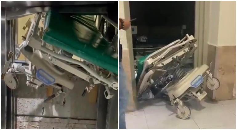 Dentro del eelvador habían dos camilleros y una camilla vacía quedó prensada con la mitad fuera del elevador y se detuvo la caída.