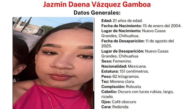 La Fiscalía General del Estado de Chihuahua emitió una alerta para localizar a Jazmín Daena Vázquez Gamboa, desaparecida desde el 11 de agosto de 2025 en Nuevo Casas Grandes. La joven, de 21 años, fue vista por última vez en esa localidad y se desconoce su paradero.