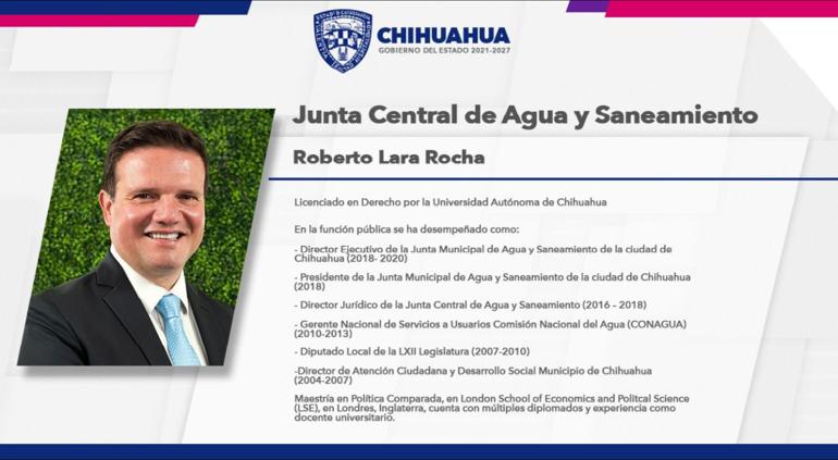 En un evento con sede en el hotel Sheraton, esta mañana la gobernadora electa María Eugenia Campos Galván anunció a los funcionarios que integrarán su gabinete durante su mandato como titular del Gobierno del Estado 2021-2027, donde reveló que Roberto Lara Rocha será el nuevo Director de la Junta Central de Agua y Saneamiento.